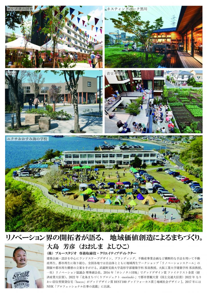 講師には、大島芳彦さん(株式会社ブルースタジオ 専務取締役・クリエイティブディレクター)を迎え、「リノベーションの発想による地域価値の再生」と題し、講演を行います。