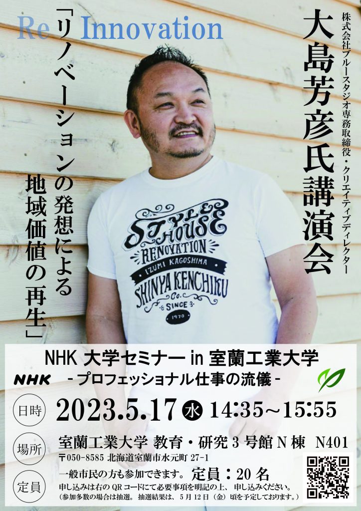 このたび、室蘭工業大学ではNHK室蘭放送局との共催により、創造工学科建築土木工学コース(3,4年)及び環境創生工学系専攻建築学コース(1,2年)、その他学生、教職員、一般市民、胆振地域所在の企業等の皆様を対象としたセミナーを開催します。
